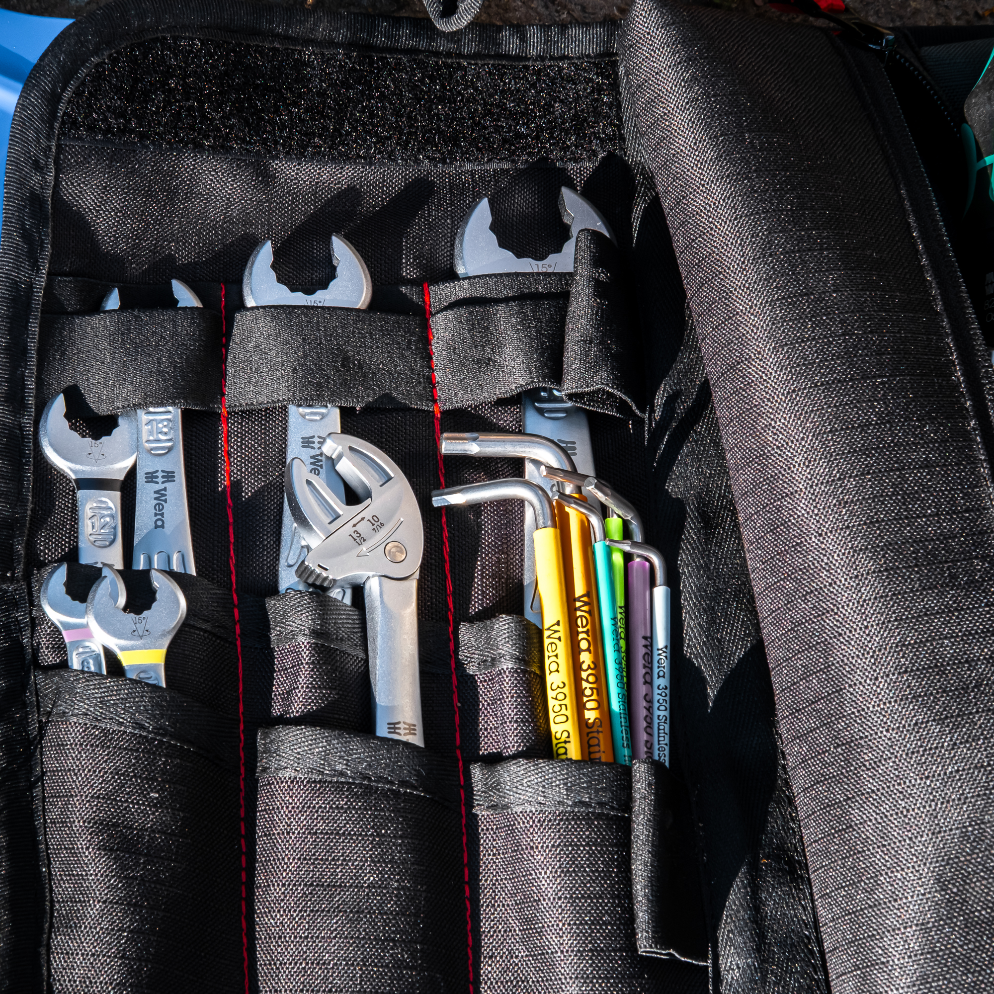 The StowCrow avoids all that with a flat-pack design that folds like a book instead of a sausage. It’s slim and tidy and slides easily into panniers, tank bags, or backpacks without wasting space. Inside, modular sleeves and removable pouches keep tools secure and organised, while two zip pockets handle smaller spares and repair bits.